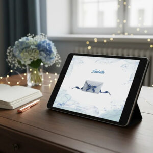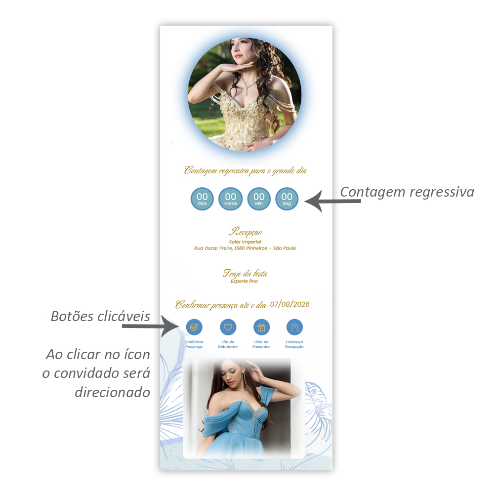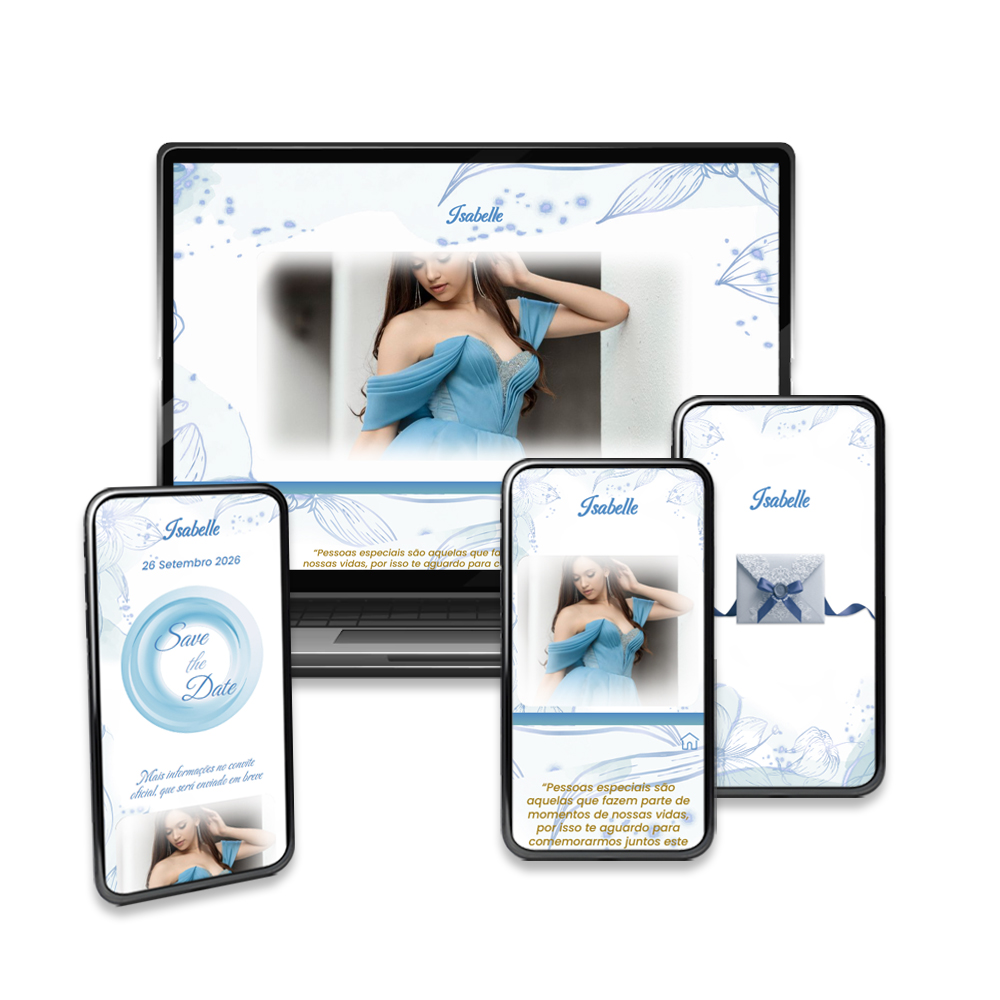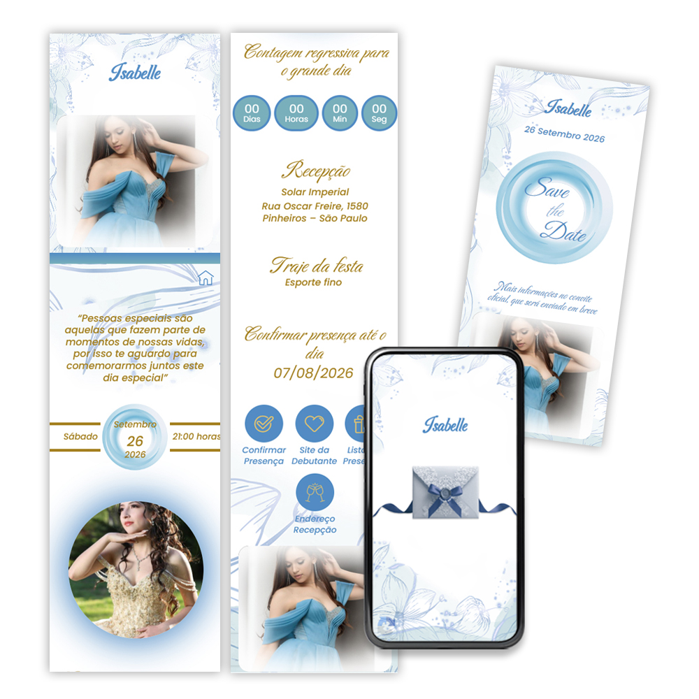 Convite Digital Interativo Debutante Botões e Música – Império Azul