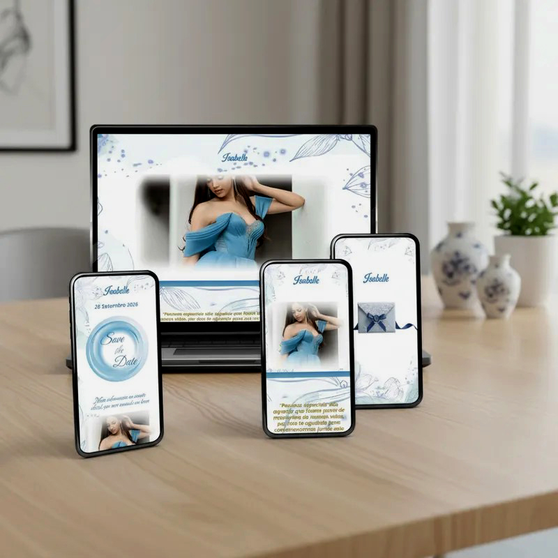 Convite Digital Interativo Debutante Botões e Música – Império Azul